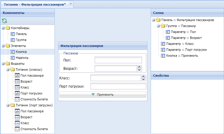 Для функционирования формы на информационной панели, на форме требуется разместить параметры виджетов и кнопку, по которой установленные значения параметров буду применяться к виджетам.